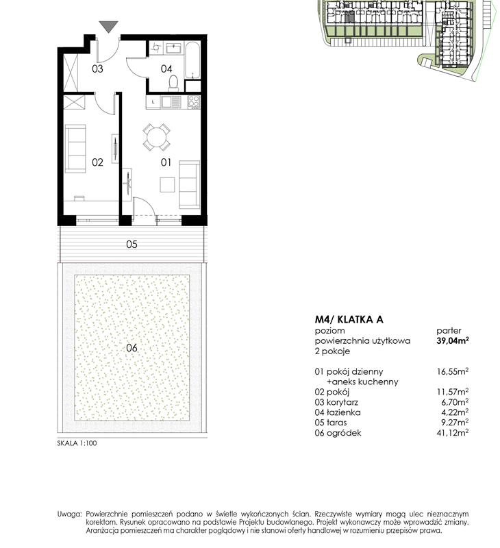 Przedstawiamy dwupokojowy lokal mieszkalny oznaczony symbolem A M4 o pow. 39,04m2, położony na parterze.