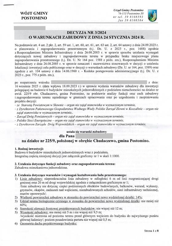 Działka o powierzchni 938 mkw., w kształcie prostokąta o wymiarach 41 x 23 m, położona na terenie, dla którego uchwalono decyzję o warunkach zabudowy, zezwalającą na budowę domu mieszkalnego, jednorodzinnego.