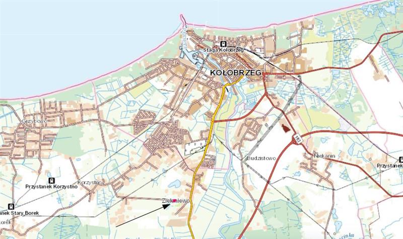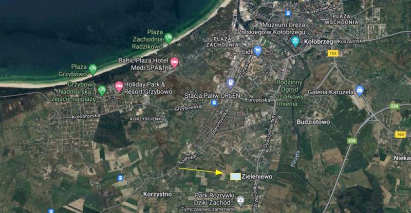 Działka położona przy drodze utwardzonej łączącej miejscowości Zieleniewo i Korzystno. Obydwie te miejscowości traktowane są jako przedmieścia Kołobrzegu. Parcela ma wielkość 1900 m2 co jest wyjątkowe w tej