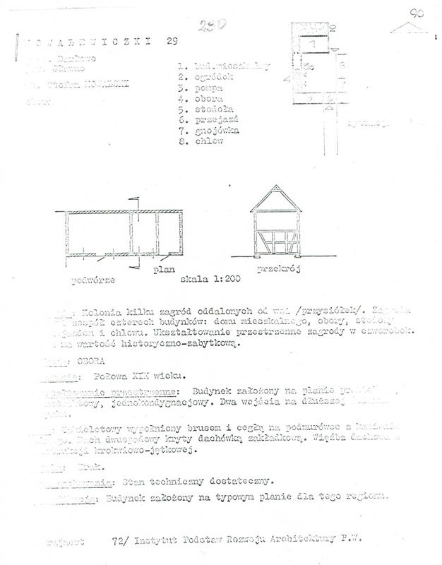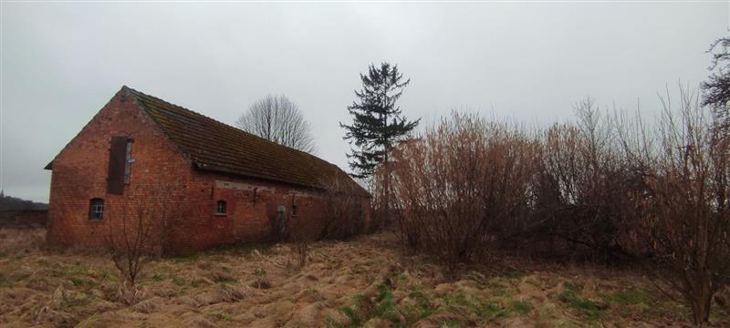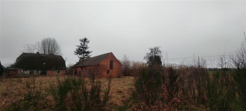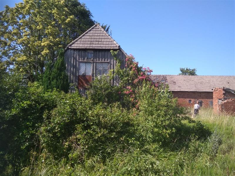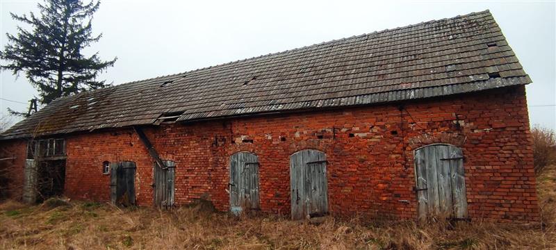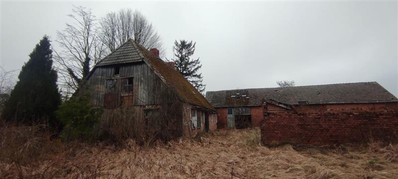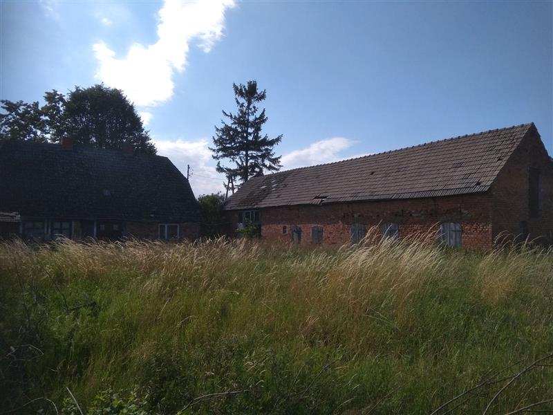 Działka ma kształt zbliżony do prostokąta, o szerokości ok. 80 m i długości ok. 100 m. Budynek mieszkalny jest konstrukcji szkieletowej, wypełnionej cegłą i brusem, na podmurówce z kamienia - wymaga remontu lub wyburzenia. Budynek gospodarczy jest w lepszym stanie, murowany z cegły, również do remontu.