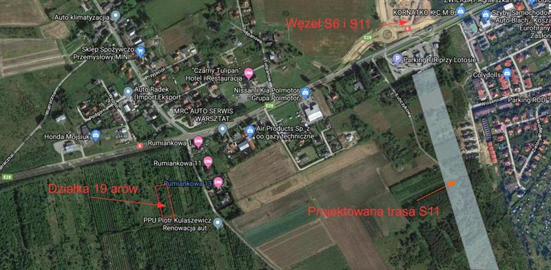 Idealne położenie wzlędem odległości od nowej trasy S6 i projektowanej S11. Odległość od węzła Bielice to około 1 km. Bezpośredni dojazd do działki drogą gruntową.