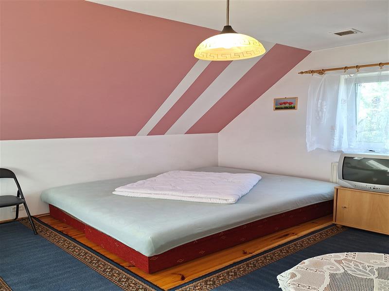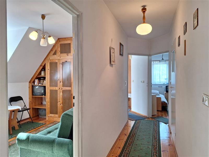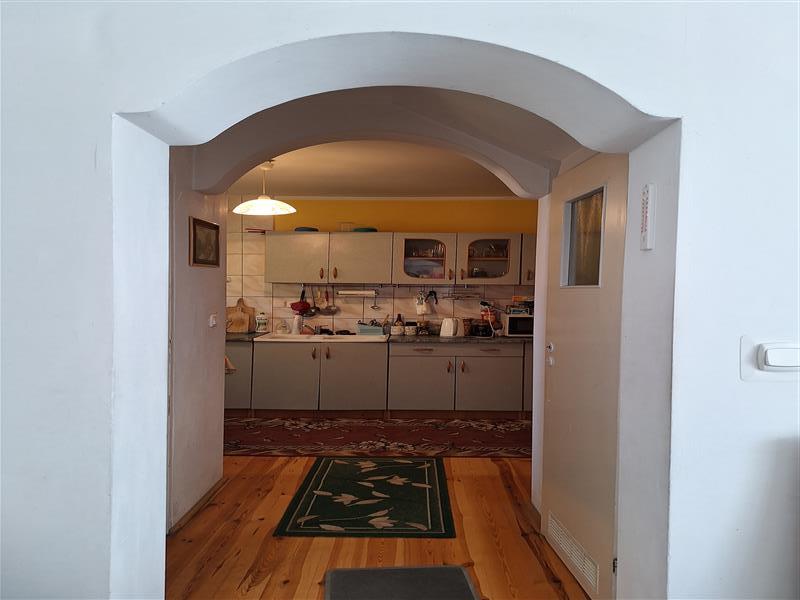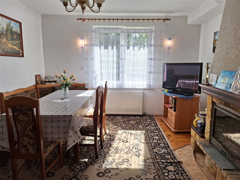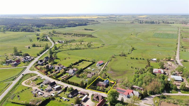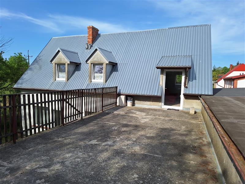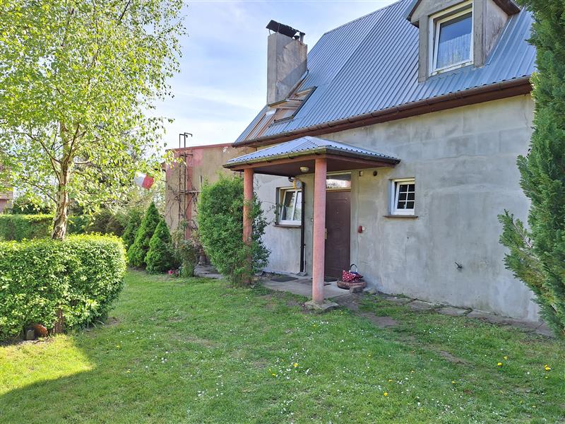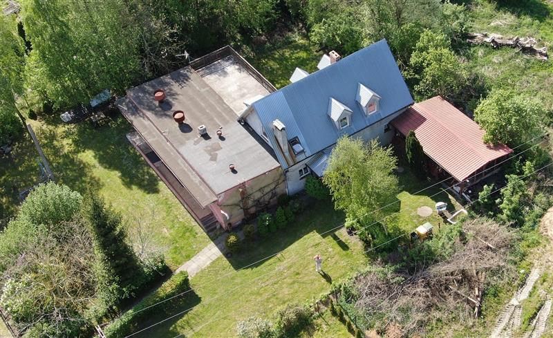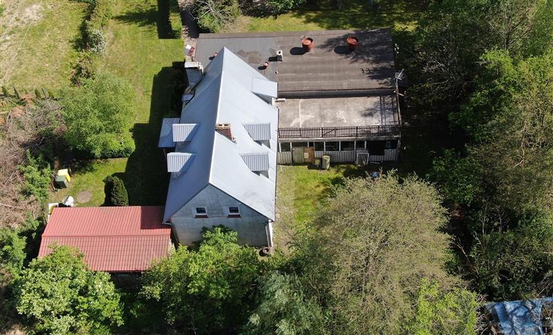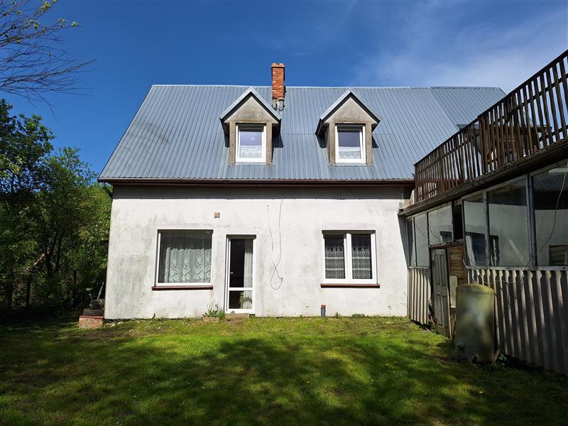 Dom z 5 pokojami z możliwością zamieszkania i jednoczesnego wynajmu. Na parterze budynku znajduje się salon z kominkiem, duży pokój, kuchnia z dostępem do rozległej części gospodarczej, łazienka oraz spiżarnia. Na piętrze znajdują się trzy pokoje, dwie łazienki, pomieszczenie przechodnie, oraz bardzo przestronny taras (40 mkw.) Z piętra jest wejście na poddasze (schody strychowe). Powierzchnia użytkowa domu to około 120 mkw. Na parterze znajdują się pomieszczenia po dawnej zlewni mleka o sumie powierzchni około 95 mkw. - możliwość adaptacji na dodatkową funkcję, bądź kolejne pokoje. Dodatkowo drewutnia o pow. 40 mkw.