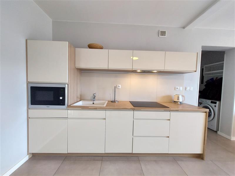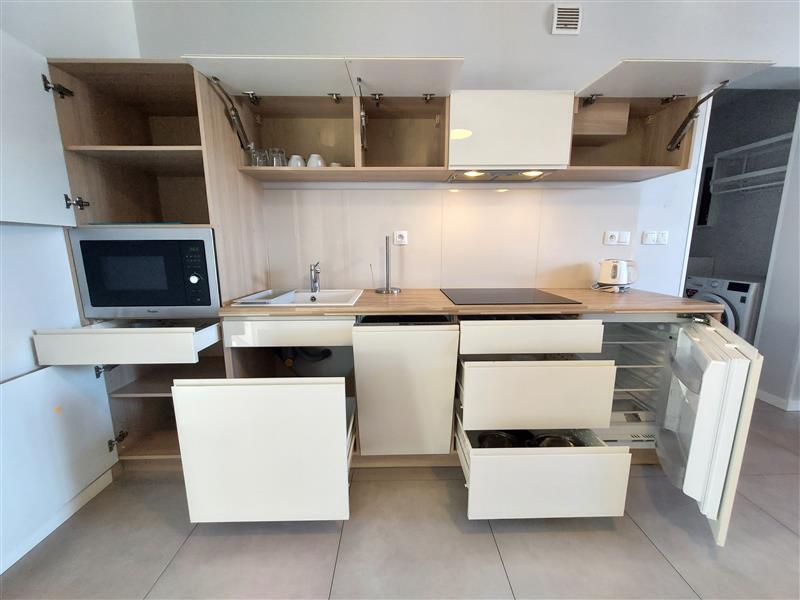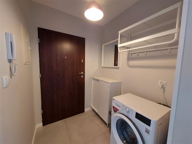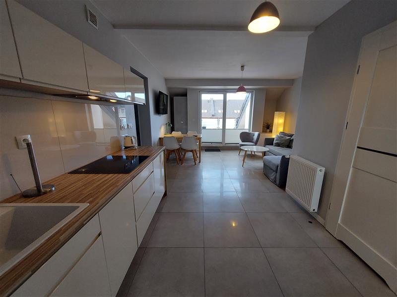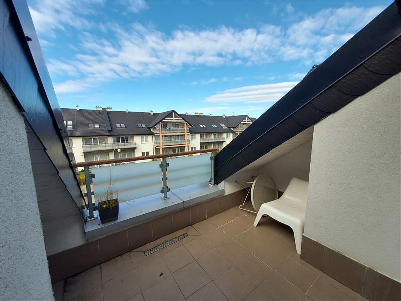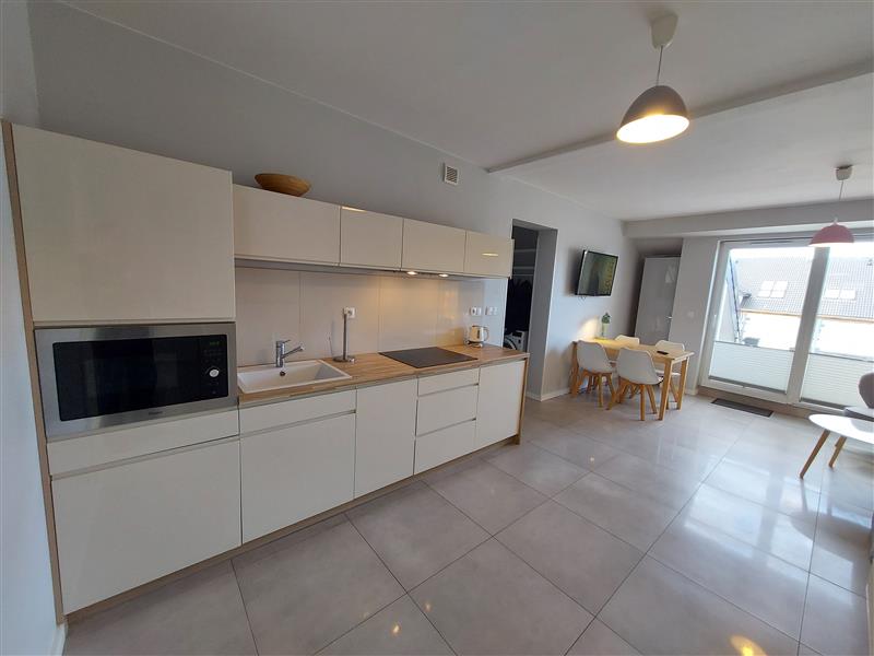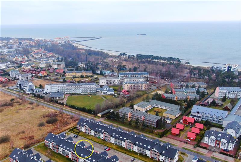Mieszkanie składa się z dużej przestrzeń ze swobodnie wydzielonymi: salonem, kuchnią oraz jadalnią, kolejne pomieszczenia to sypialnia z dwuosobowym łóżkiem, oraz łazienka wyposażona w prysznic z przesuwnymi, przeszklonymi drzwiami. Dodatkowym atutem nieruchomości jest szeroki balkon zlokalizowany od strony morza - stanowiący przedłużenie wnętrza, dostępny przez nieinwazyjne drzwi balkonowe. Do apartamentu wchodzi się z estetycznej klatki schodowej z czujnikiem ruchu, dodatkowo na parterze zlokalizowana jest rowerownia. Budynek wyposażony jest w domofon oraz alarm.