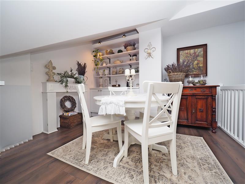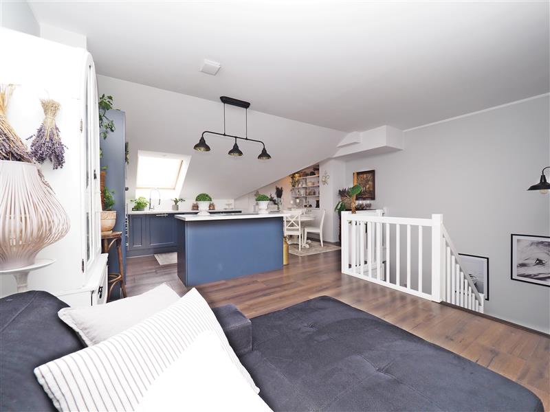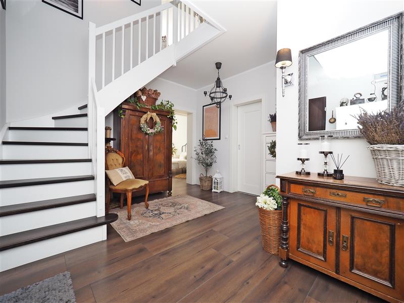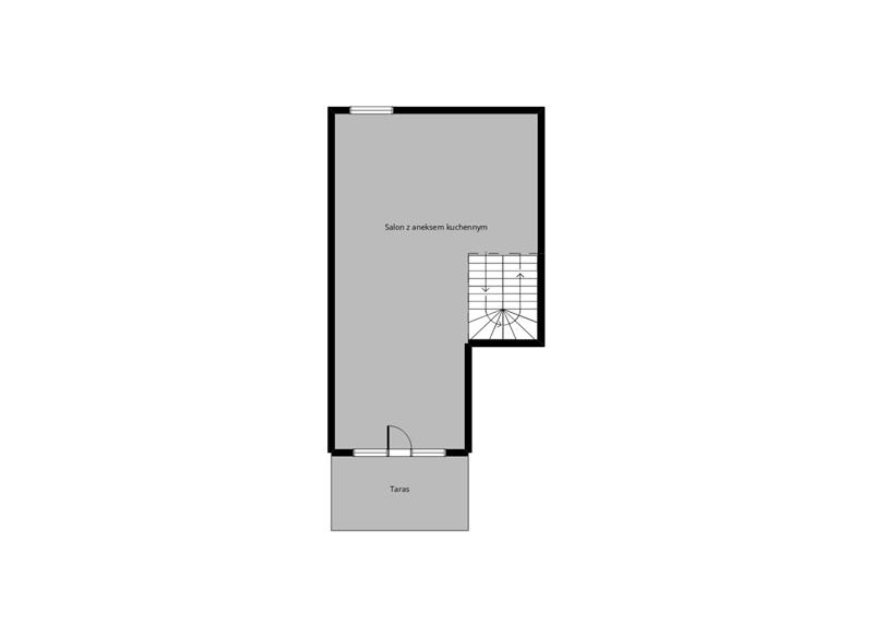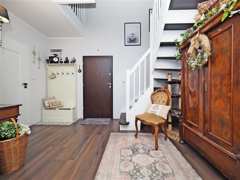 Na II poziom (antresolę) prowadzą piękne drewniane schody, gdzie zaaranżowano duży salon z aneksem kuchennym (ok. 30 m2). Z salonu wyjście na taras.