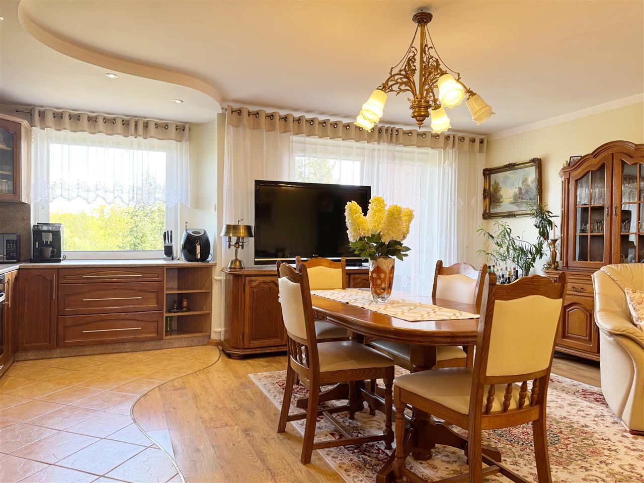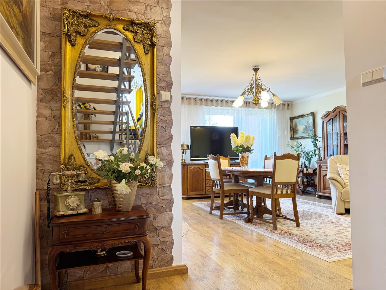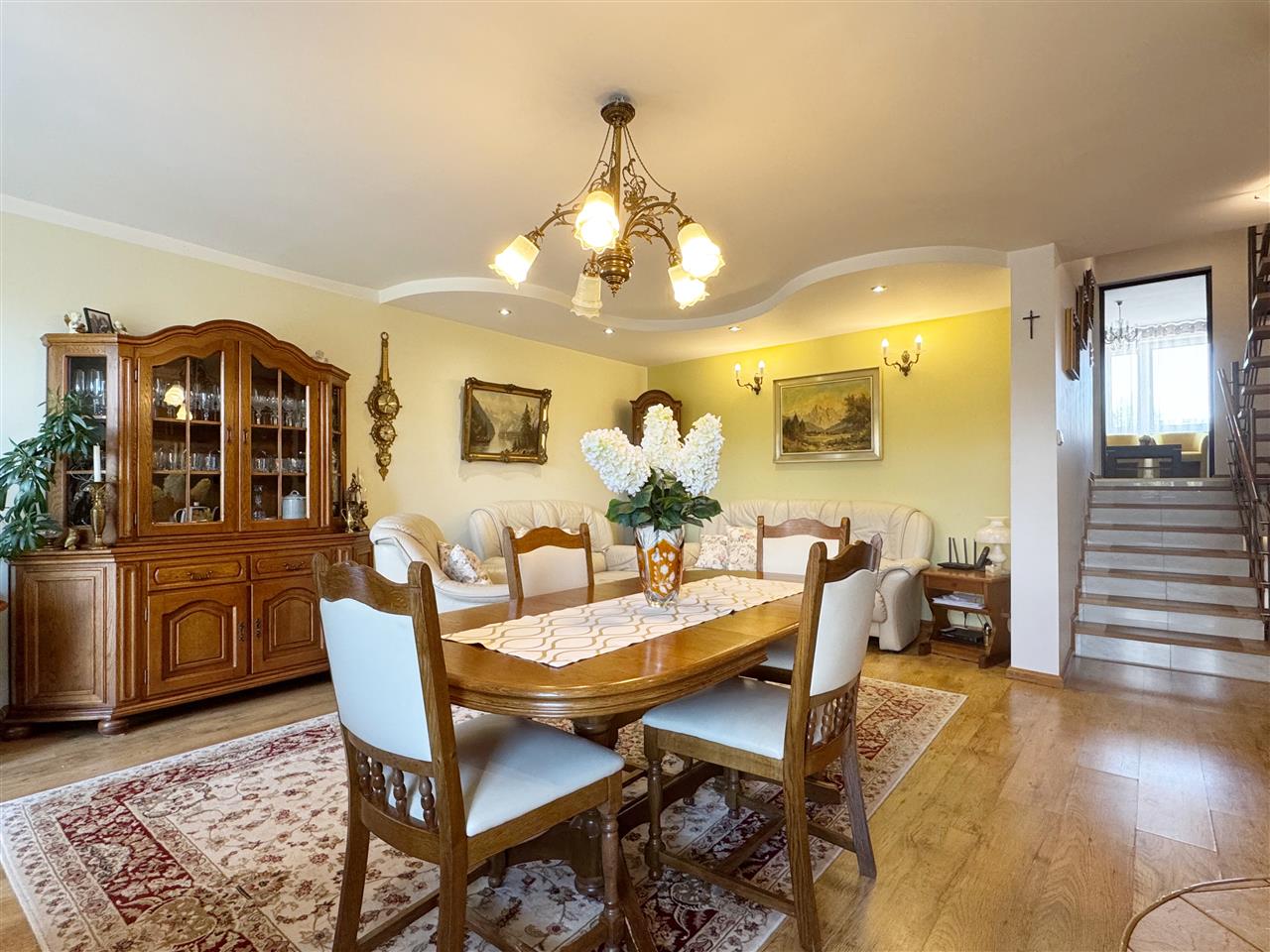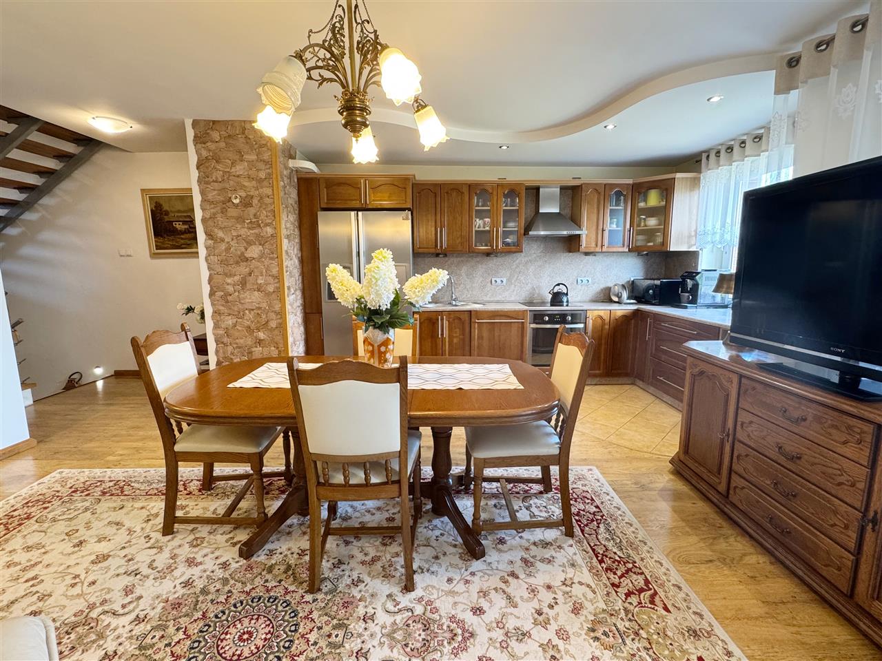 - Meble kuchenne na piętrze drewniane oraz sprzęt AGD pozostają na wyposażeniu nieruchomości.