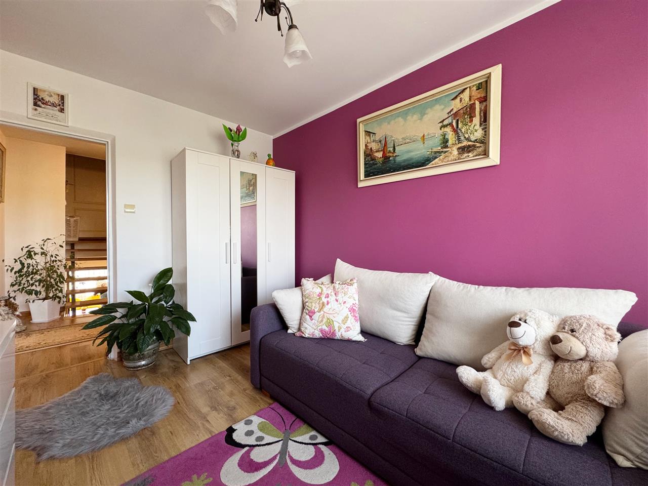 PÓŁÓPIĘTRO: duża sypialnia (została połączona z dwóch pokoi), łazianka połączona z wc, hall.