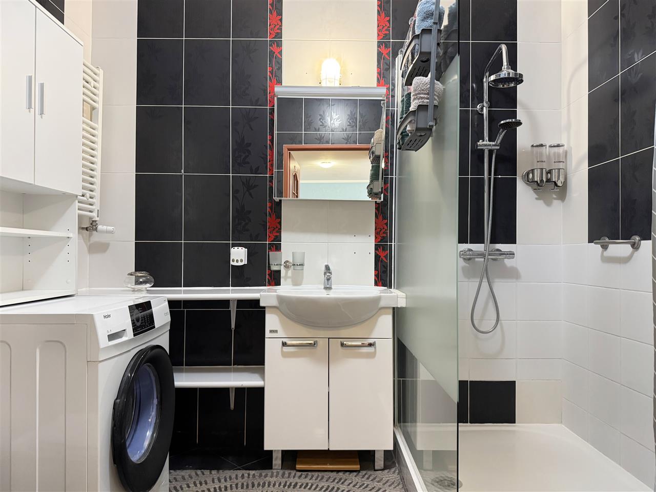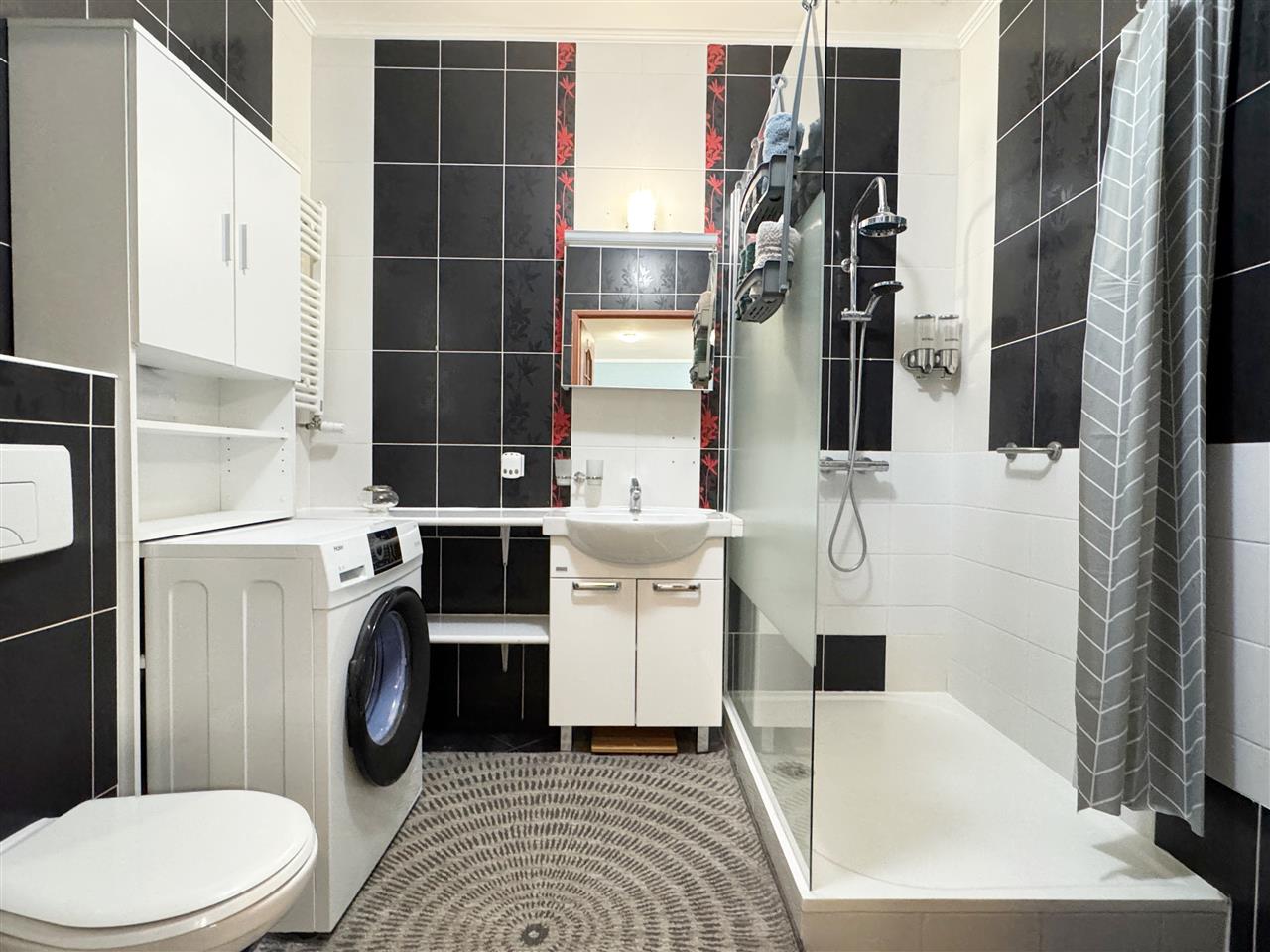 Łazienka połączona z wc: kabina prysznicowa, umywalka z szafką, lustro, wc, pralka, glazura + terakota.