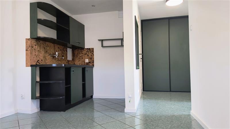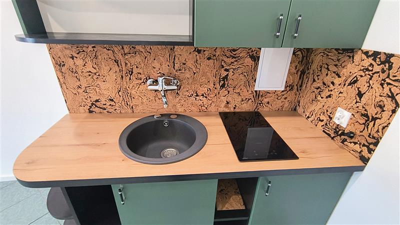 W pokoju z aneksem kuchennym na podłodze terakota, ściany gładź malowana, w części kuchennej zabudowa mebli.