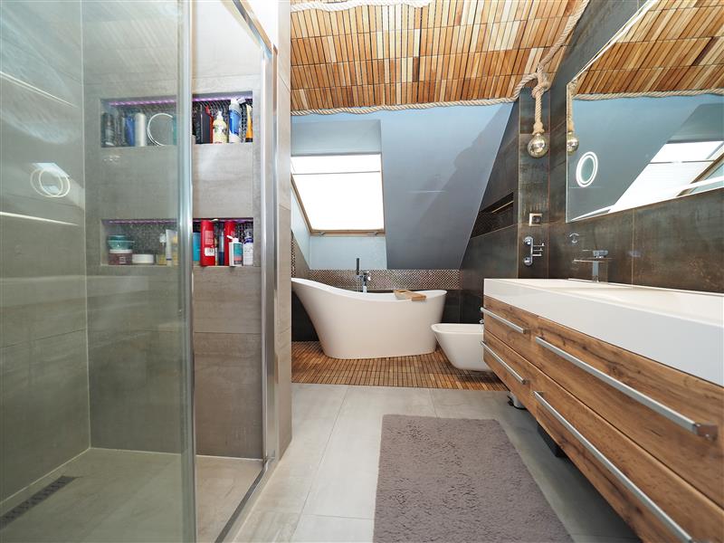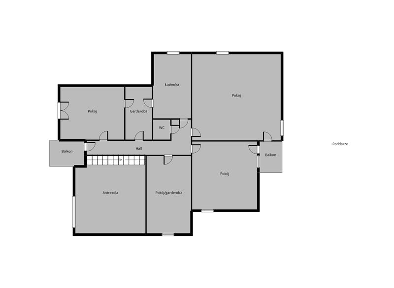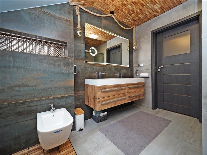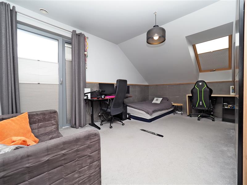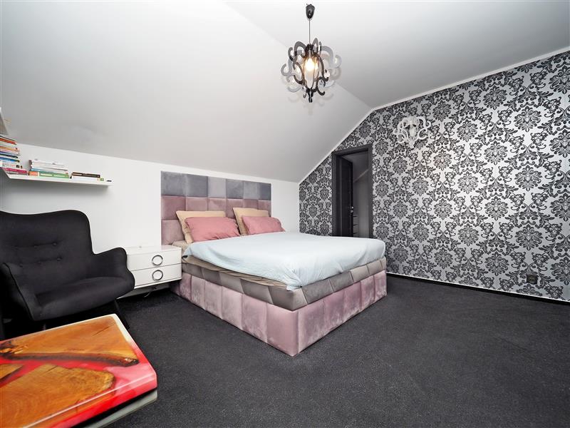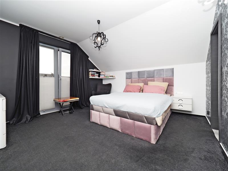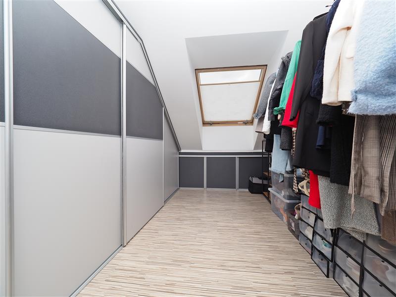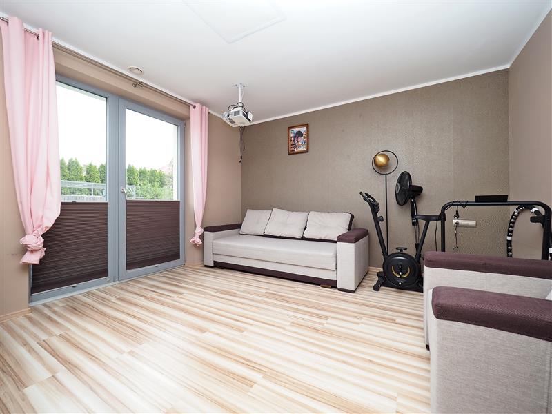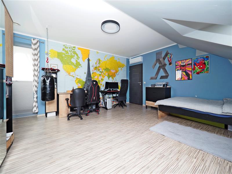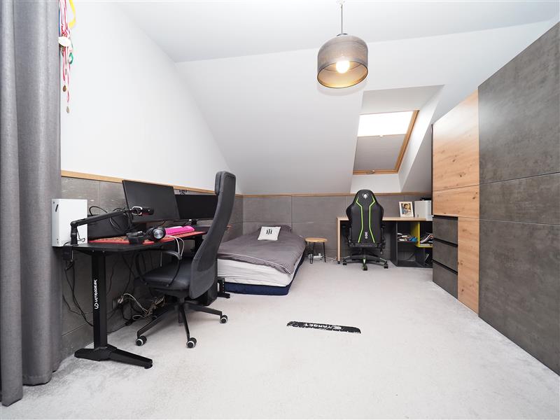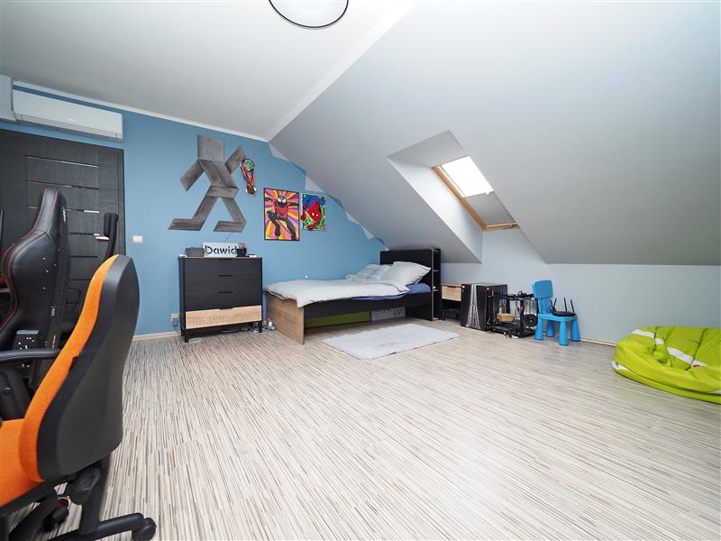 Na poddaszu znajdują się 4 pokoje, w tym jeden obecnie zaaranżowany na kolejną garderobę, garderoba przy sypialni, łązienka oraz osobne wc. Dla komfortu właścicieli z jednej z sypialni mamy przejście do osobistej garderoby, a dalej do łazienki. W łazience zsyp na brudy, który prowadzi do pralni.