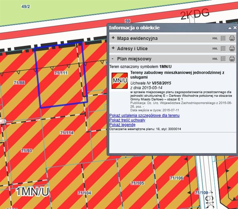 Zgodnie z obowiązującym miejskim planem zagospodarowania przestrzennego działka leży na terenie zabudowy mieszkaniowej jednorodzinnej z usługami, oznaczonym symbolem "1 MN/U". Wysokość zabudowy 10 m, maksymalnie dwie kondygnacje nadziemne, z dopuszczeniem kondygnacji podziemnej. Dachy wielospadowe o kącie nachylenia od 35 do 50 stopni. Minimalna powierzchnia biologicznie czynna 40%. Maksymalna powierzchnia zabudowy 40%. Wskaźnik intensywności zabudowy = 1.