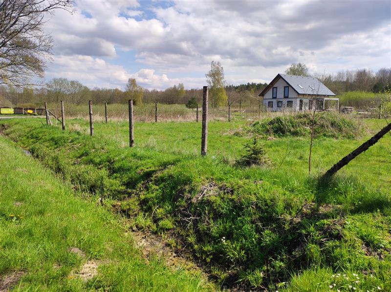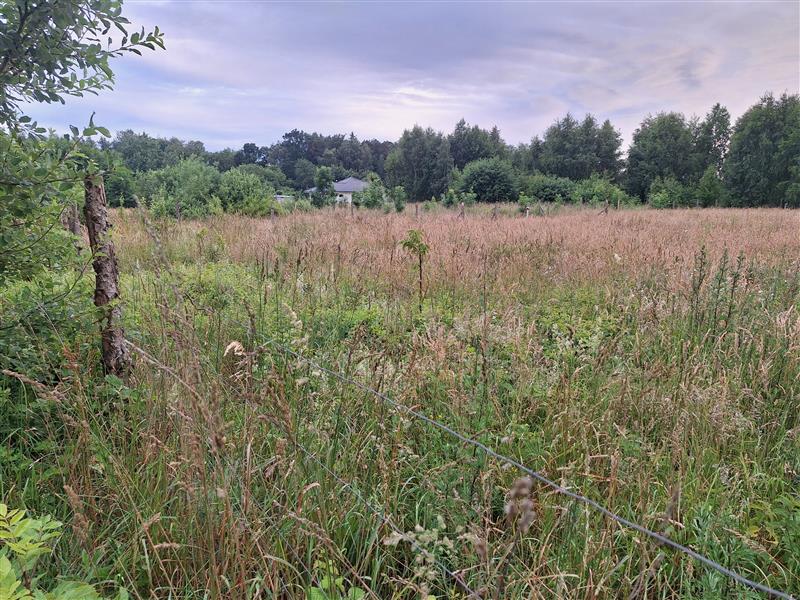 Prąd i woda na granicy działki. Teren działki płaski i suchy, w całości ogrodzony siatką leśną.