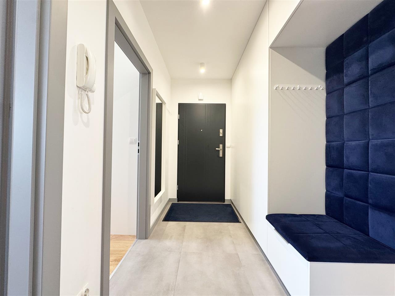 Przedpokój: zabudowa meblowa w postaci szafy, szafek oraz siedziska, drzwi antywłamaniowe.