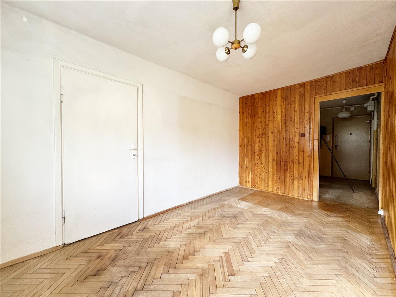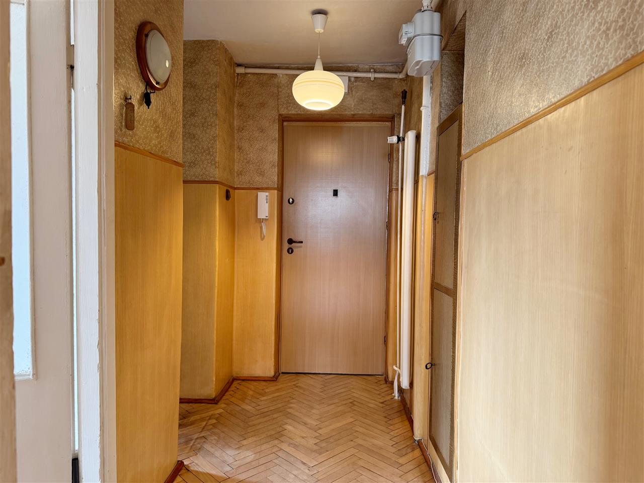 Przedpokój: na podłodze parkiet, ściany malowane oraz tapeta.