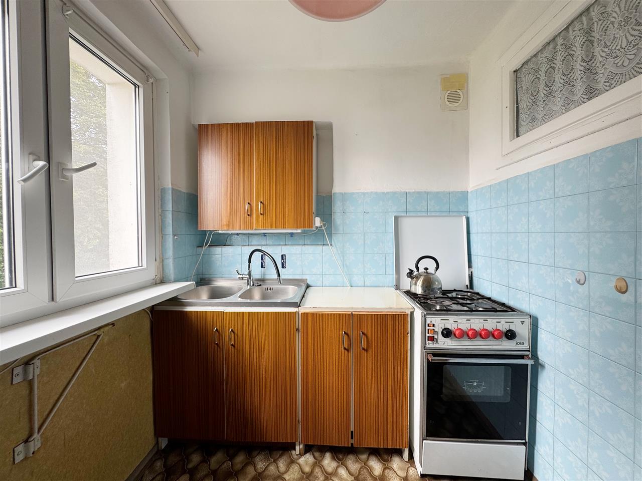 Kuchnia: na podłodze linoleum, na ścianach pas glazury starszego typu, ściany: malowane.