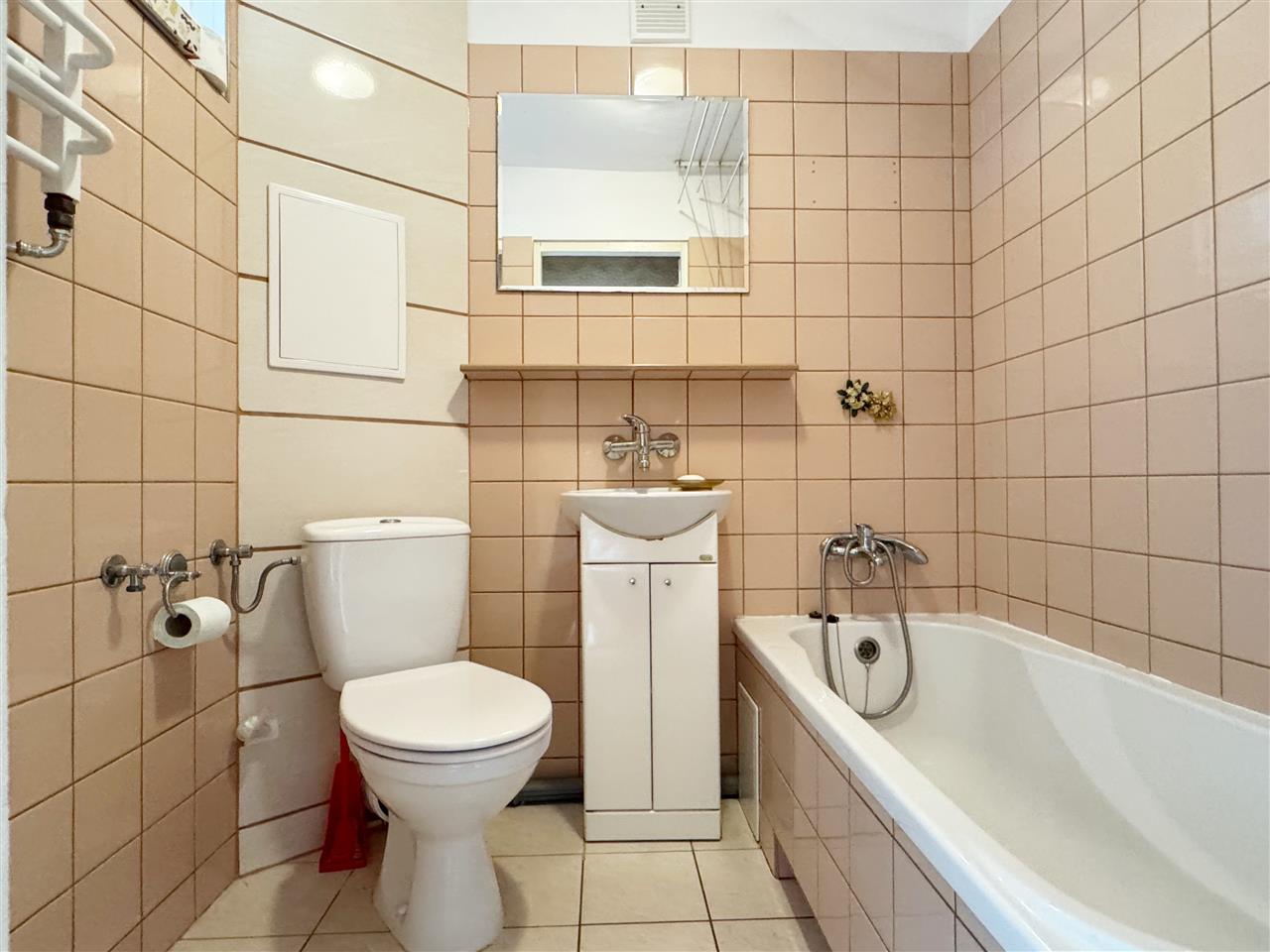 Łazienka połączona z wc: wanna, wc, glazura + terakota.