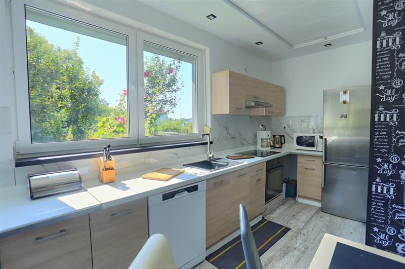 funkcjonalna kuchnia z wykończeniem w terakocie.