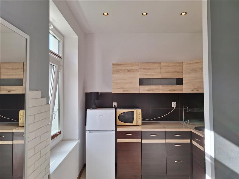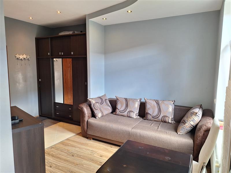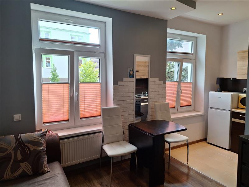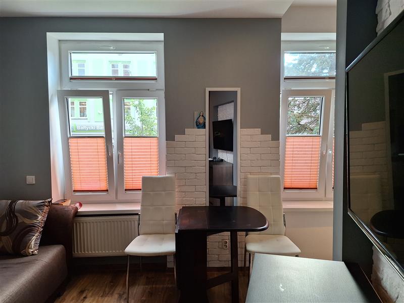Kawalerka znajduje się na podwyższonym parterze historycznego budynku z czerwonej cegły, przy ulicy Bogusława X w Darłowie. Powierzchnia mieszkania to 21,00 mkw. - jest to jedna uniwersalna przestrzeń w której zawiera się kuchnia, jadalnia, salon, duża szafa, oraz masywna kanapa rozkładana w łóżko. Łazienka w całości jest wykończona kafelkami, wyposażona w prysznic oraz pralkę. Na ścianie znajduje się dwufunkcyjny kocioł gazowy.