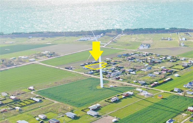 Skrzynka z prądem znajduje się na granicy działki. W odległości ok. 150 m od działki znajduje się wiatrak.