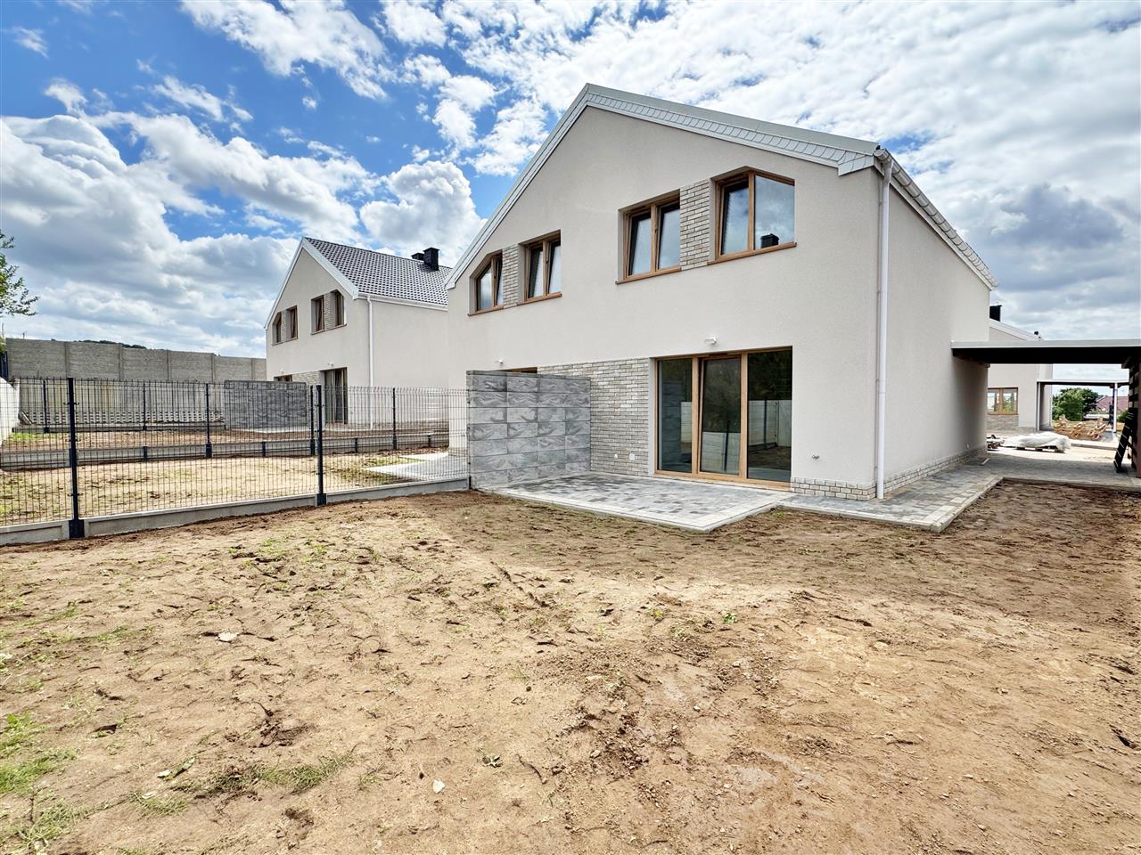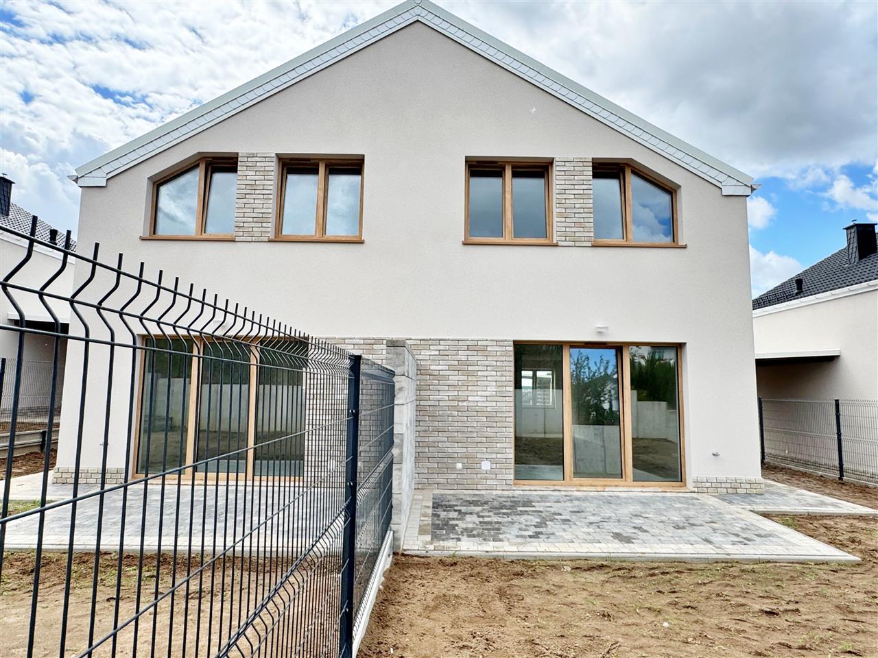 Wykończenie w standardzie developerskim – idealne dla osób, które chcą stworzyć wnętrza dopasowane do własnego gustu: tynki maszynowe, wtyczki, kontakty, ogrzewanie indywidualne gazowe- podłogowe firmy Tece wraz z piecem 2-funkcyjnym 24 kW firmy DE Dietrich ze sterownikiem. Dodatkowo w łazience i wc na parterze kaloryfer – drabinka. Stolarka okienna firmy Veka w kolorze Dąb WOODEC TURNER strona zewnętrzna, od wewnątrz w kolorze białym. Rozprowadzona instalacja do podłączenia urządzeń. Instalacja RTV - w każdym pokoju gniazdko RTV. Wykonane podejście do kominka. Dach: dachówka cementowa. Drzwi wejściowe antywłamaniowe. Schody wewnętrzne wylewane betonowe. Dojście do budynku oraz teren przed nim wyłożony kostką polbrukową lub ażurową. Brama wjazdowa (szlaban) na pilota. Wydzielone ogródki (określony sposób do korzystania). Budynek niepodpiwniczony.