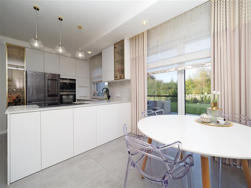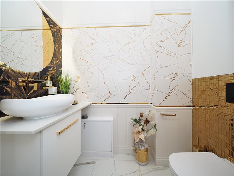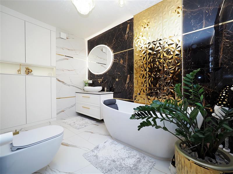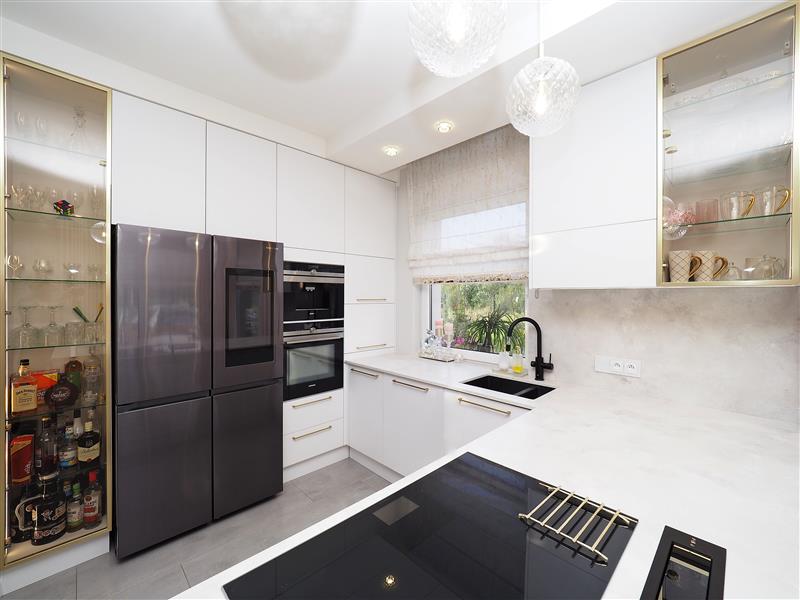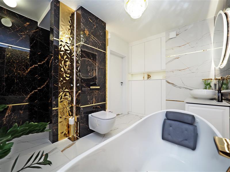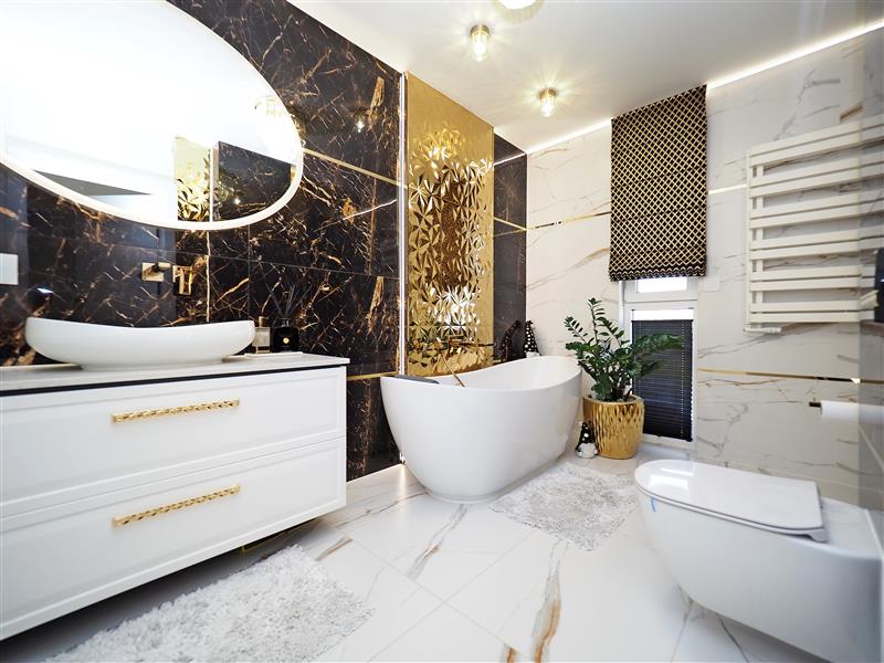 Kuchnia wykonana przez firmę Formi z kamiennymi blatami i złotymi elementami dekoracyjnymi. Wyposażona w wysokiej klasy sprzęt firmy Siemens ze sterowaniem przez WIFI. W cenie sprzęt AGD w zabudowie, czyli piekarnik z funkcją mikrofali, zmywarka, ekspres do kawy i pochłaniacz nablatowy. Łazienka i wc wykończona płytkami firmy Tubądzin, armatura firmy Hansgrohe. Drzwi wewnętrzne firmy Porta montowane przez firmę Domstyl, włączniki dotykowe firmy Simon.