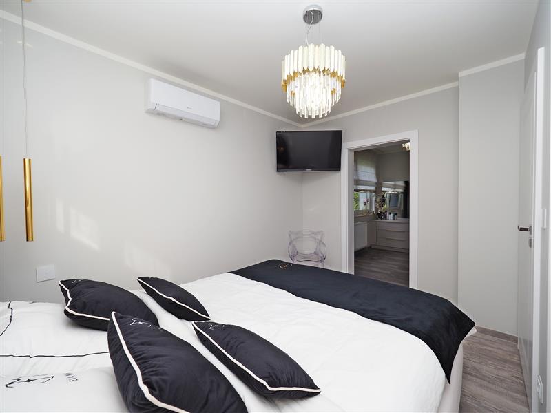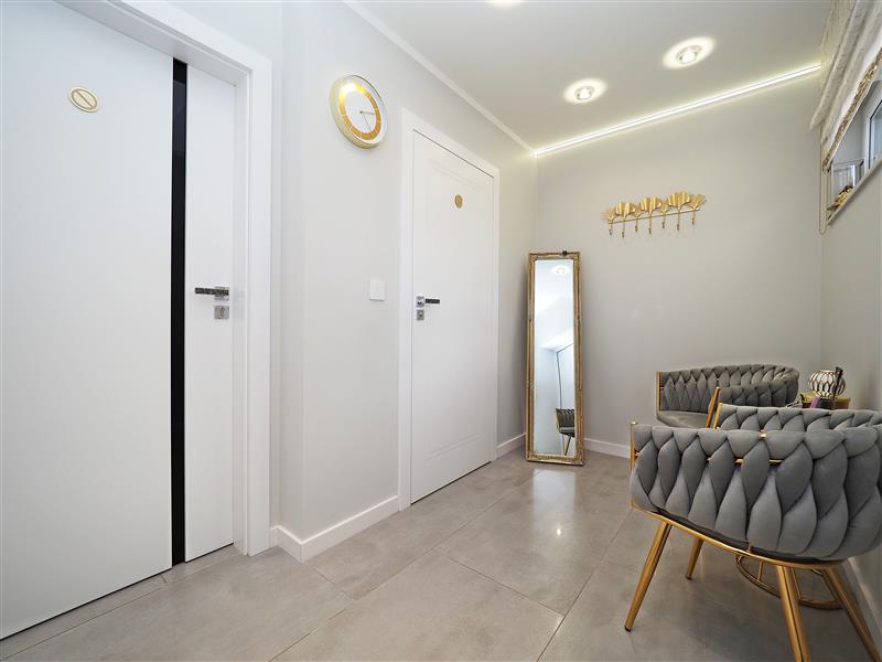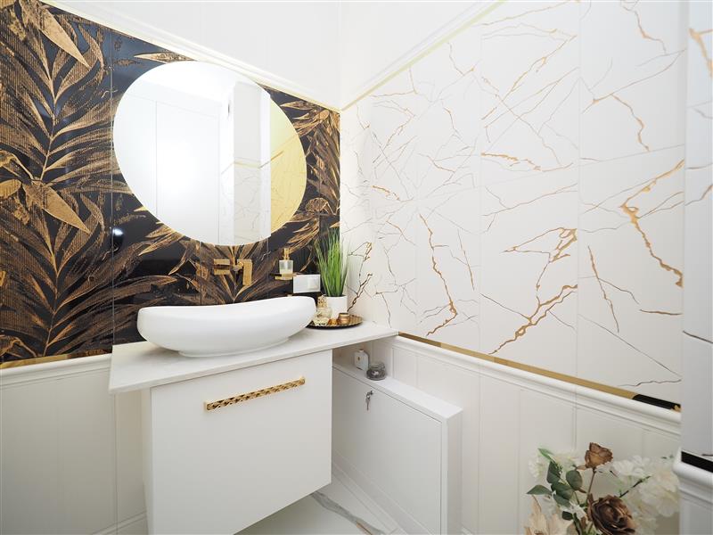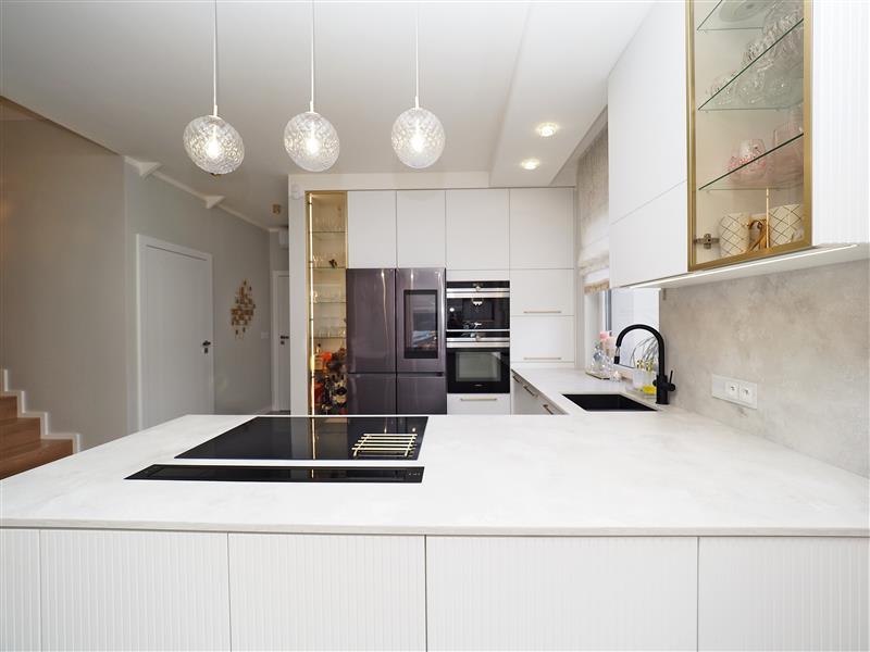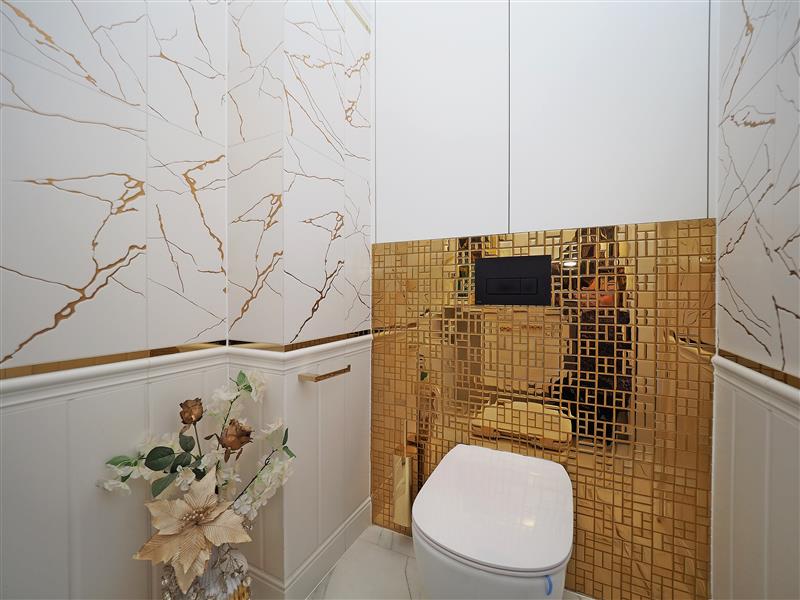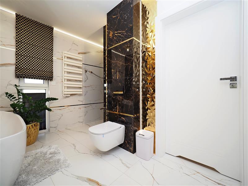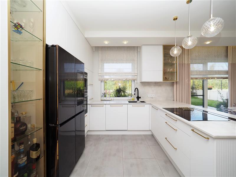 Kuchnia wykonana przez firmę Formi z kamiennymi blatami i złotymi elementami dekoracyjnymi. Wyposażona w wysokiej klasy sprzęt firmy Siemens ze sterowaniem przez WIFI. W cenie sprzęt AGD w zabudowie, czyli piekarnik z funkcją mikrofali, zmywarka, ekspres do kawy i pochłaniacz nablatowy. Łazienka i wc wykończona płytkami firmy Tubądzin, armatura firmy Hansgrohe. Drzwi wewnętrzne firmy Porta montowane przez firmę Domstyl, włączniki dotykowe firmy Simon.