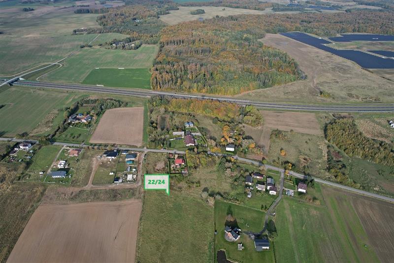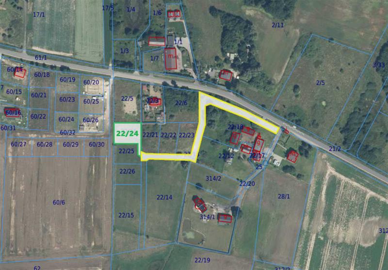 Wjazd na działkę z drogi asfaltowej powiatowej (21/2) poprzez działkę 22/13 pełniącą funkcję drogi wewnętrznej (ustanowiona służebność dla sprzedawanej działki).
