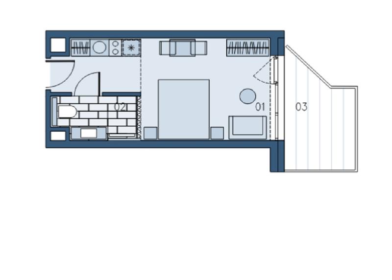 Pokój dzienny z aneksem kuchennym (18,80m2), łazienka (3,73m2).