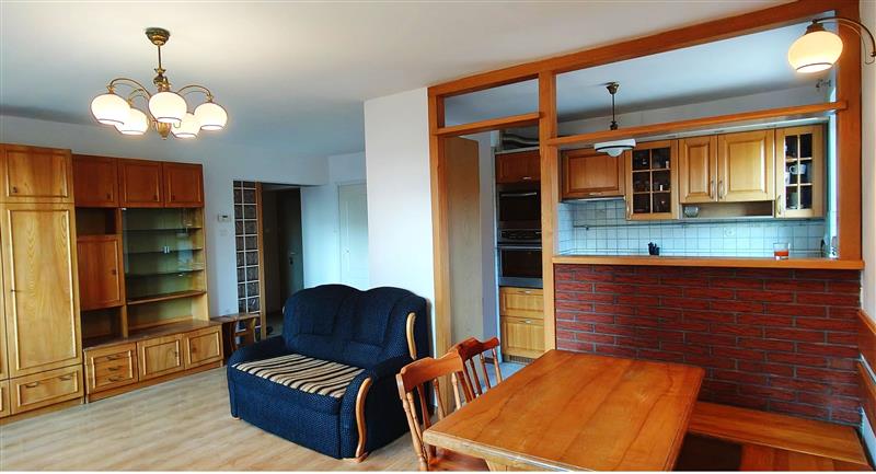 - kuchnia z oknem (7 m2) otwarta na pokój i przedpokój– z zabudową szafek oraz ze sprzętem AGD w bardzo dobrym stanie (zaledwie 3-letnim),