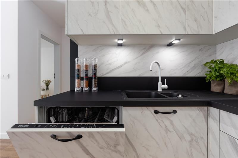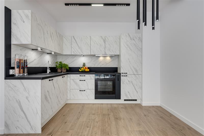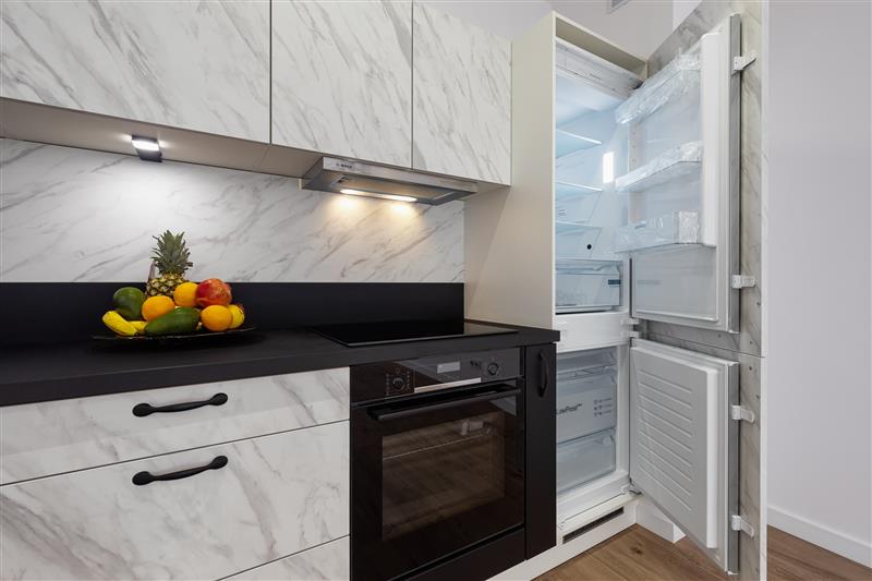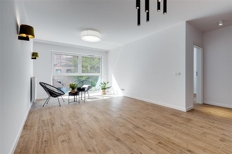 Lokal został wykończony pod klucz, z wysokiej jakości materiałów.  Drzwi marki Dewro, włoskie płytki Marazzi i Imola w  łazience i na podłogach w całym mieszkaniu, kuchnia oraz inne meble firmy Haecker, nowy sprzęt AGD w kuchni marki Bosch/Siemens, ceramika Duravit, oświetlenie Nowodvorski i AQform.