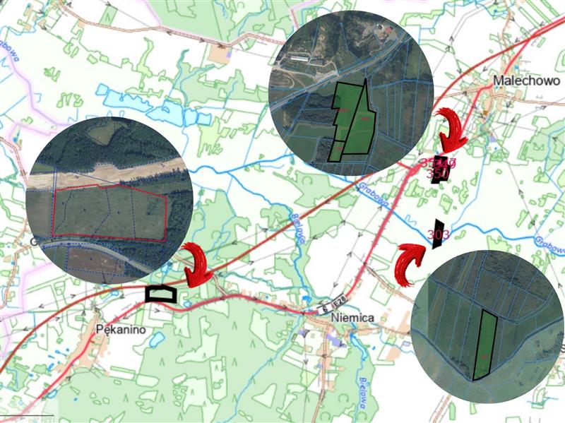 - Grunty składają się z działek: 307/3, obręb Pękaniono (6,75 ha), 354/7+350+349, obręb Malechowo(4,69 ha), 303 obręb Malechowo (2,13 ha) — co daje łącznie 13,84 ha.