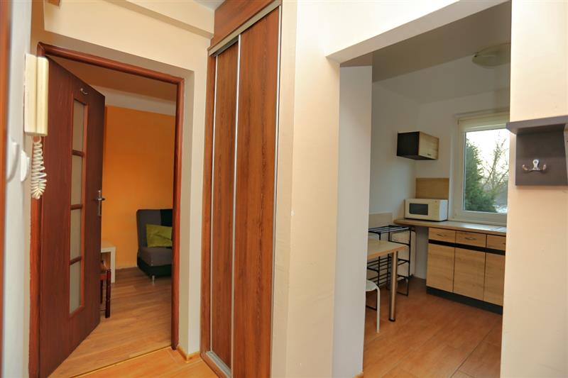 Przedpokój: panele, szafa w zabudowie starszego typu.