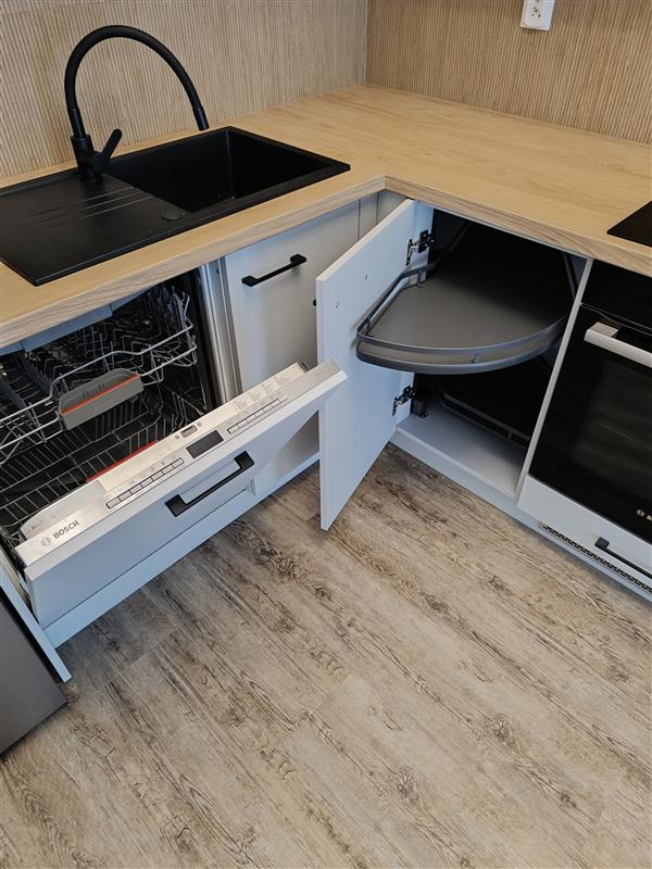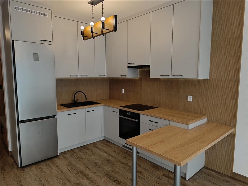 Dwa pokoje częściowo umeblowane w wysokim standardzie. Duża,  wygodna Å‚azienka, glazura i terakota w jasnej tonacji: pralka,  kabina prysznicowa,  wc typu Geberit, umywalka. Kuchnia otwarta na salon, nowe urzÄ…dzenia;  duża lodówka,  zmywarka, okap, pÅ‚yta indukcyjna, piekarnik, zlewozmywak, szafki robione na wymiar.