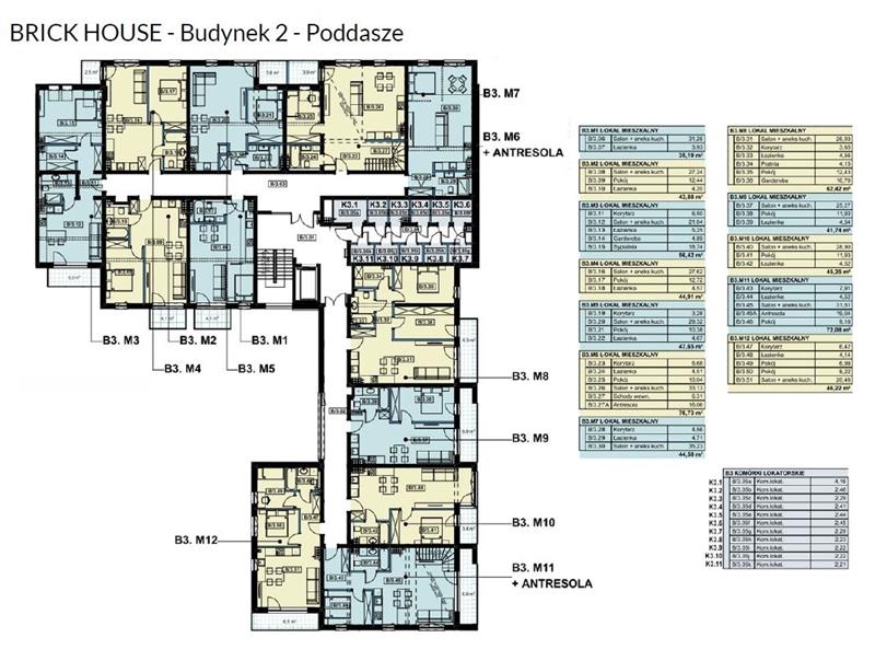Mieszkanie B3.M11  składa się z salonu połączonego z aneksem kuchennym o pow. 31.51 m2, pokoju o pow. 9.10 m2, antresoli o pow. 19.04 m2, łazienki o pow. 4.52 m2, korytarza o pow. 7.91 m2. Mieszkanie posiada loggię o pow. 6.90 m2.