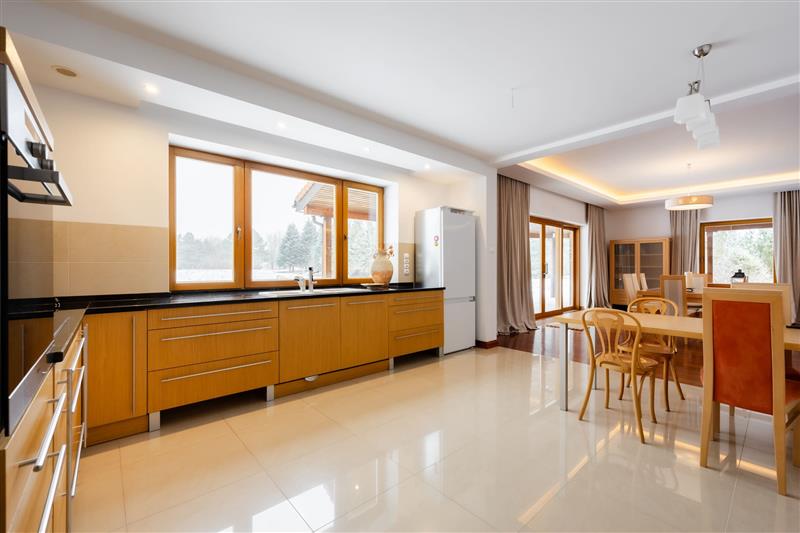 5.  Kuchnia z dużym oknem i z widokiem na ogród, połączona z hallem i z salonem. Z kuchnią jest połączona również bardzo poręczna i praktyczna ciemna i chłodna spiżarnia. Spiżarnia wyposażona jest w zlew warzywny oraz regały. Cały sprzęt AGD z firmy MIELE