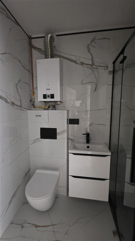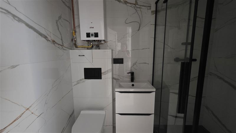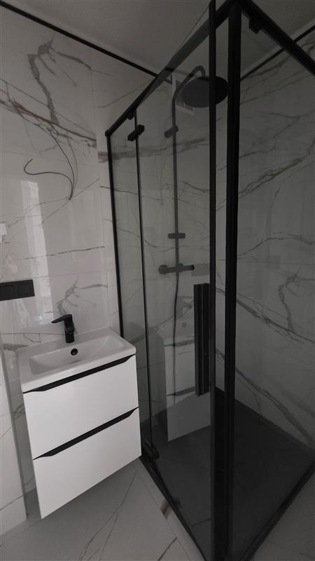 W łazience znajduje się nowoczesna kabina prysznicowa, nowe płytki, armatura .