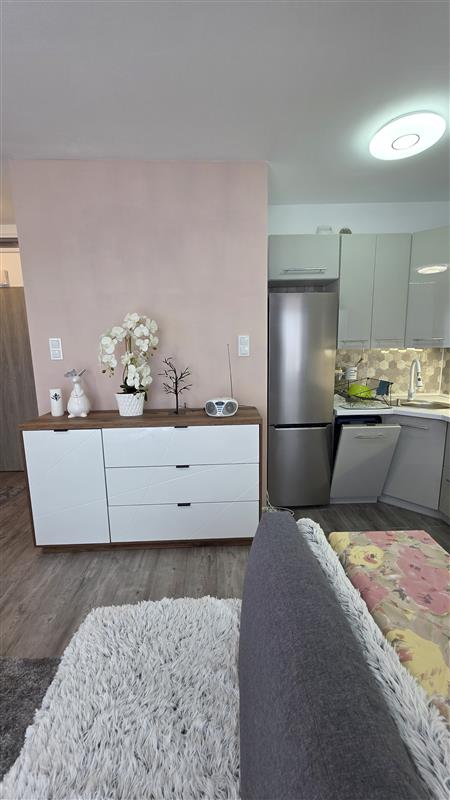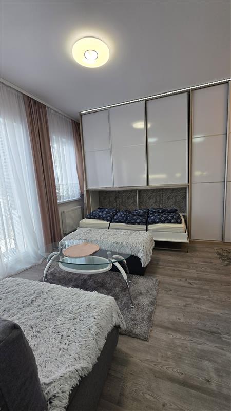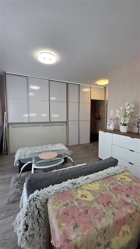 Mieszkanie składa się z przestronnego pokoju z aneksem kuchennym. Wnętrze zostało zaprojektowane z myślą o wygodzie – zastosowano nowoczesną zabudowę, która sprytnie ukrywa łóżko, dzięki czemu przestrzeń w ciągu dnia pozostaje otwarta i estetyczna. Dodatkowo w salonie znajduje się zestaw wypoczynkowy z rozkładaną kanapą.