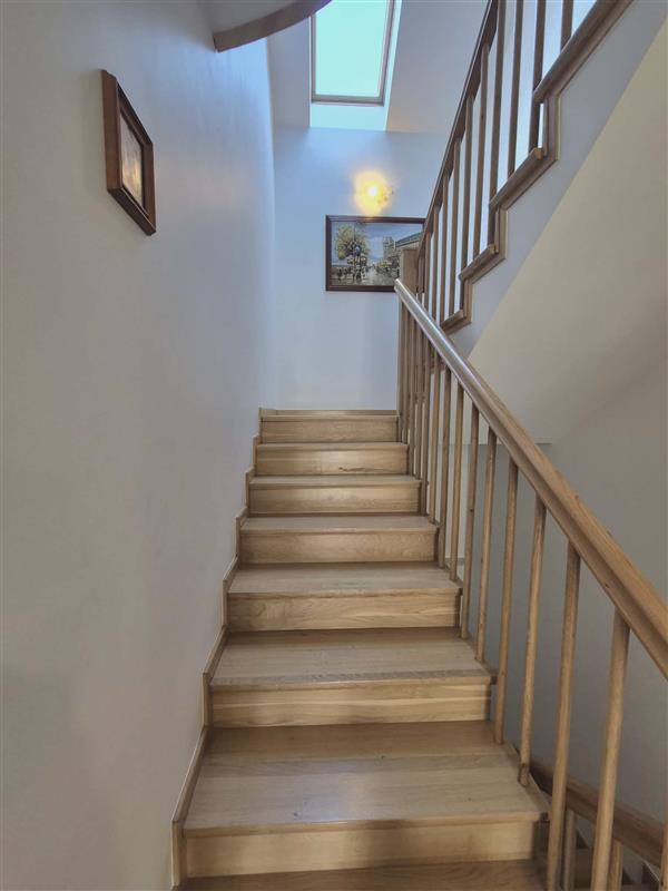 Kondygnacje łączy wewnętrzna klatka schodowa ze schodami drewnianymi, dębowymi prowadzącymi do części usługowej i garażu na 3 samochody.