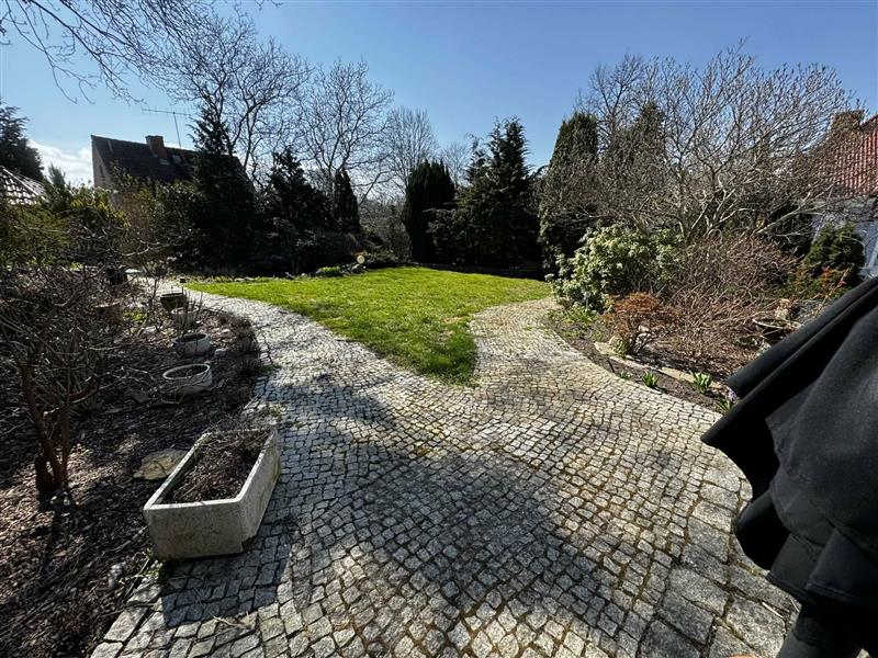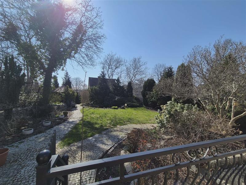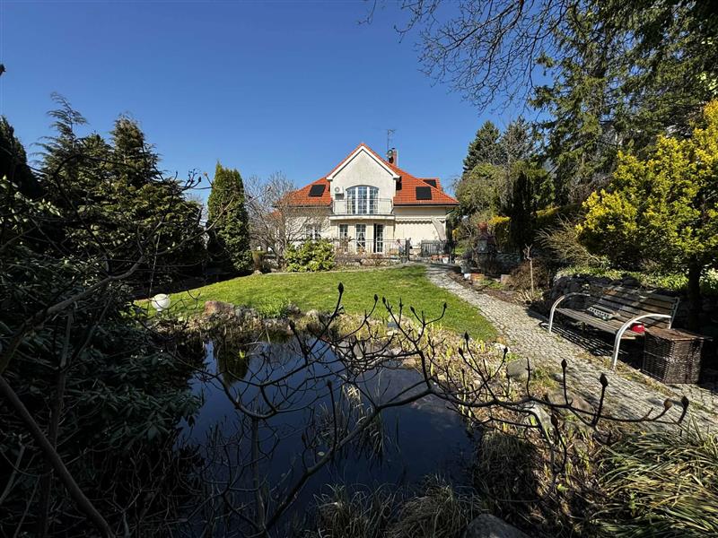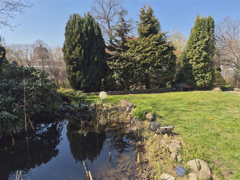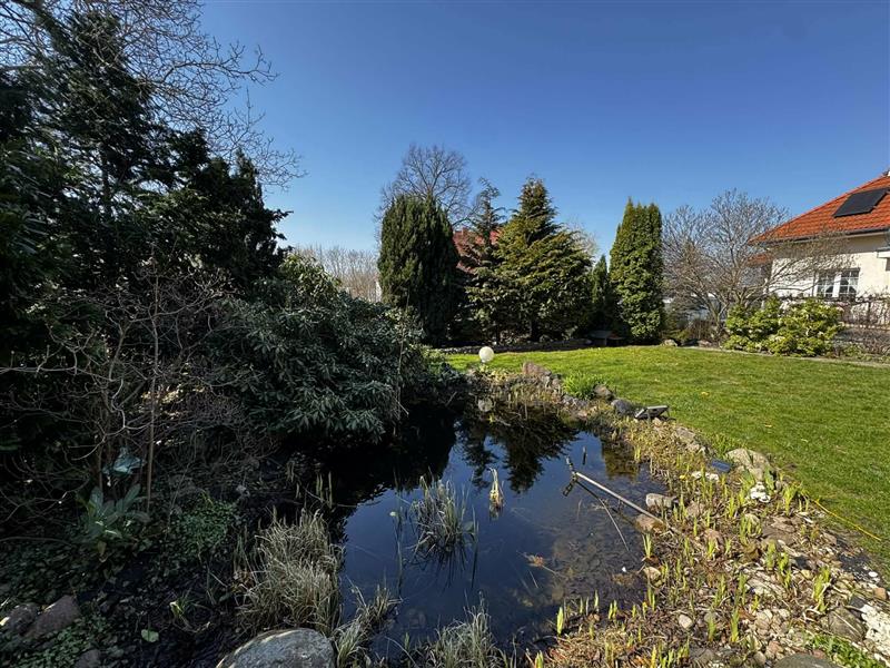 Na działce posadzone liczne krzewy ozdobne, drzewa, drzewka owocowe, oczko wodne, rabaty z kwiatami. W rogu działki stoi altanka.