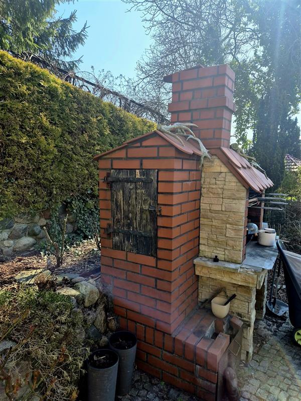 Przy tarasie umiejscowiono wędzarnię i grill. Ogród pięknie zagospodarowany.